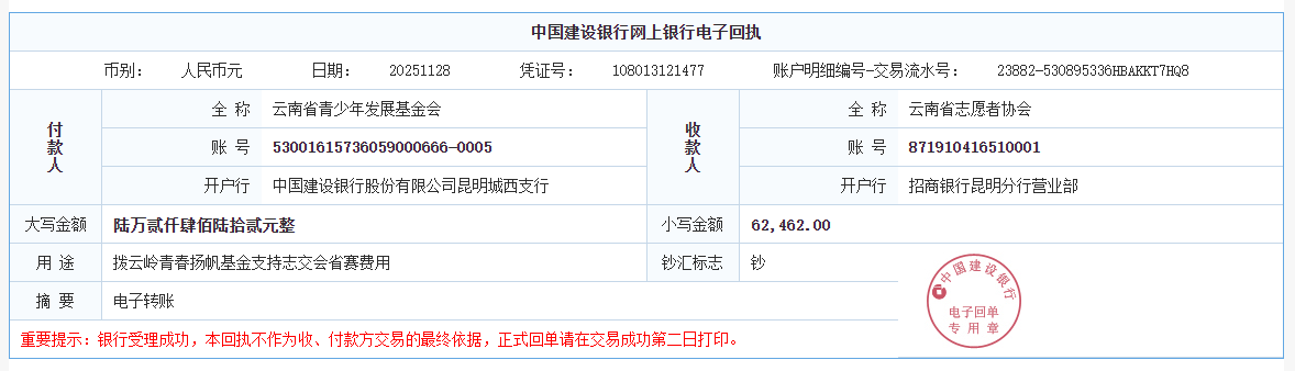第二十二期拨款:由广大爱心人士捐赠爱心善款47462元整合“大成爱心基金”15000元,已于2025年11月28日划拨62462元至云南省志愿者协会,用于开展第七届中国青年志愿服务项目大赛云南省赛。