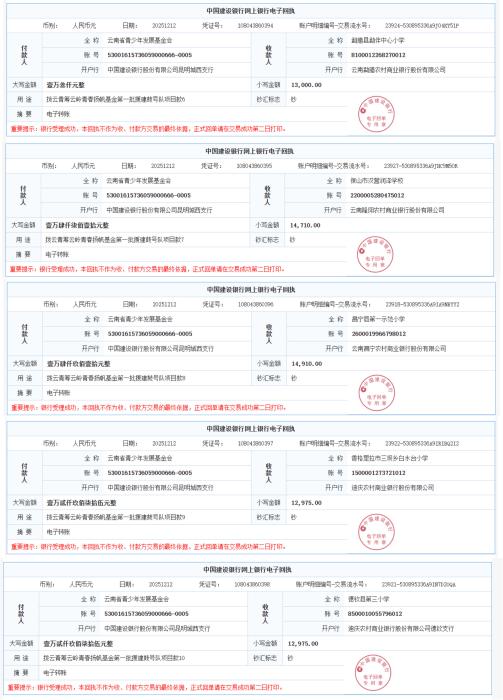 第二十三期拨款:由广大爱心人士捐赠爱心善款已于2025年12月12日划拨第一批项目款141380元,为红塔区北城街道大营育才学校、通海县纳古中心小学、华宁县右所小学、景洪市勐龙镇小街中心小学、勐海县勐满镇九年一贯制学校、勐腊县勐伴中心小学、保山市汉营润泽学校、昌宁县第一示范小学、香格里拉市三坝乡白水台小学、德钦县第三小学10所学校配置希望鼓号队。