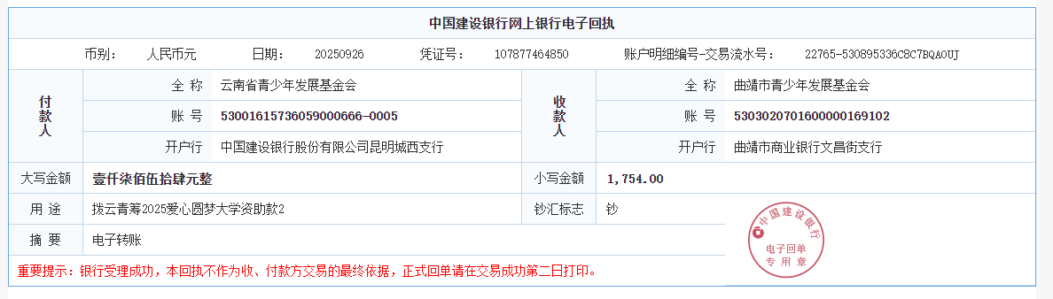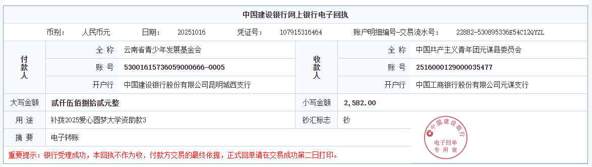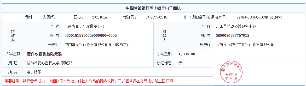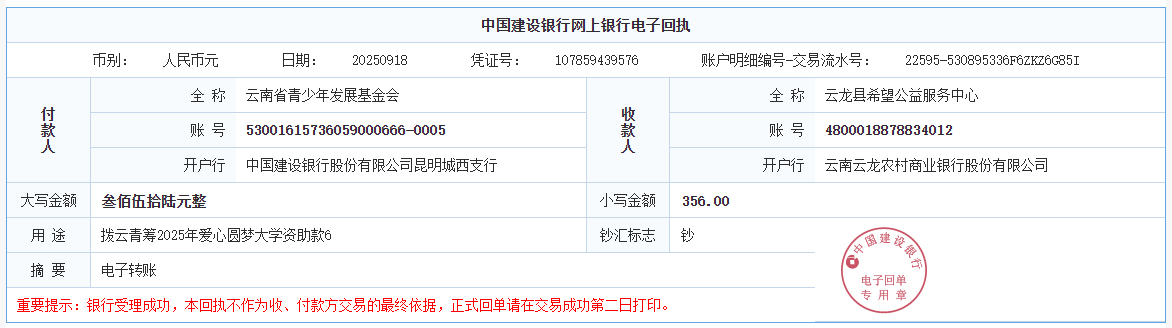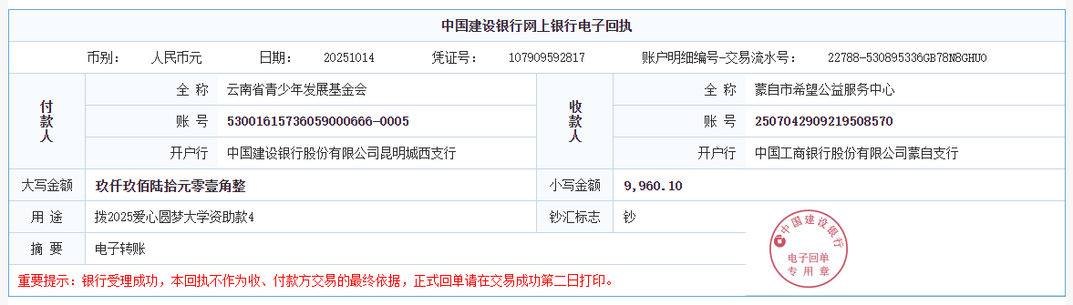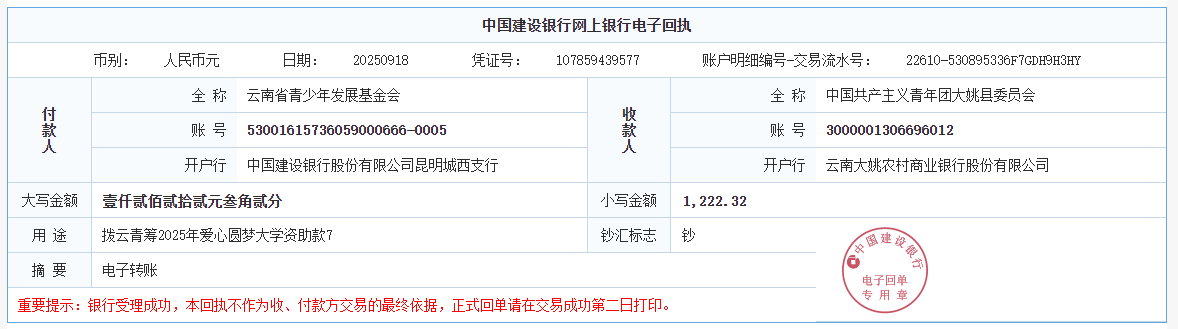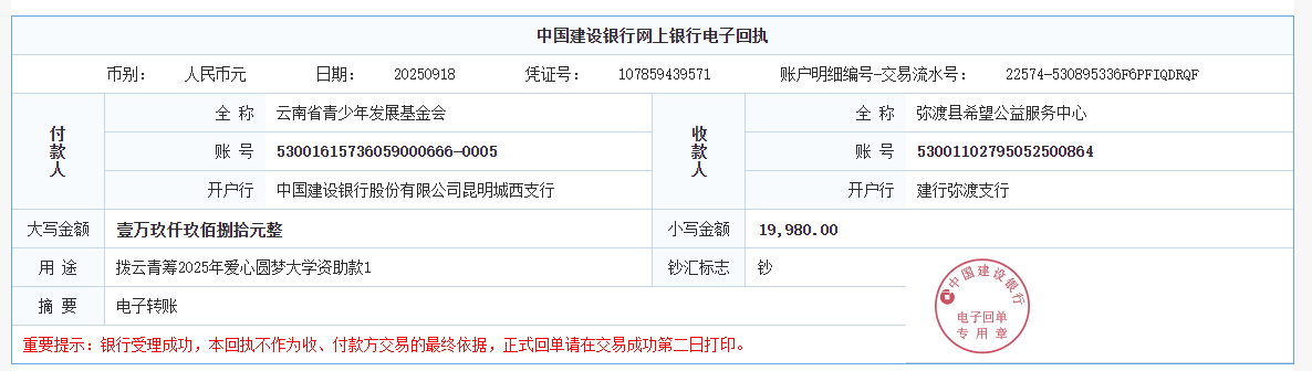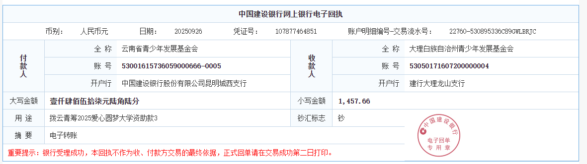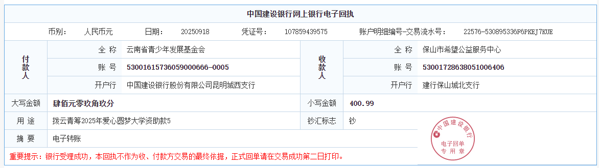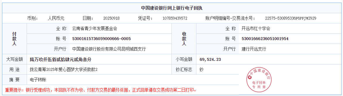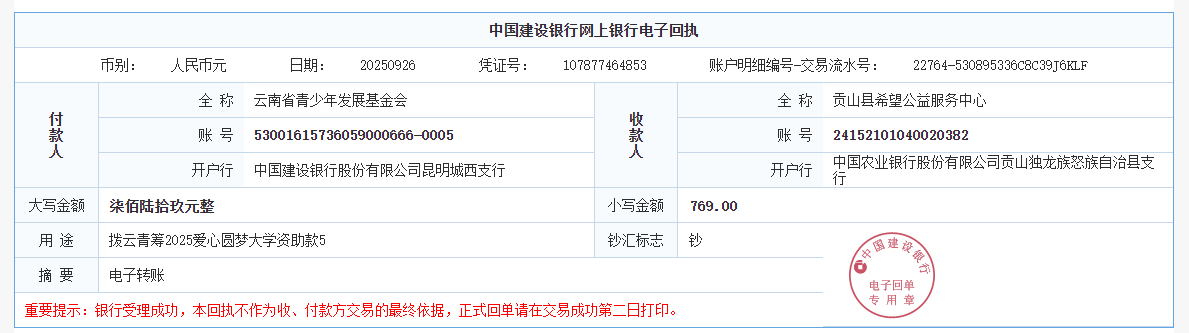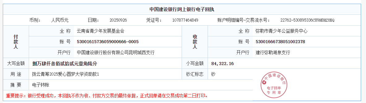 第六期拨款:由广大爱心人士线上线下捐赠的爱心善款89547.02元已于2025年9月26日划拨至弥勒市青少年公益服务中心、曲靖市青少年发展基金会、大理白族自治州青少年发展基金会、宾川县希望公益服务中心、贡山县希望公益服务中心,用于资助弥勒市25名大学新生、曲靖市1名大学新生、大理州1名大学新生、宾川县1名大学新生、贡山县1名大学新生。