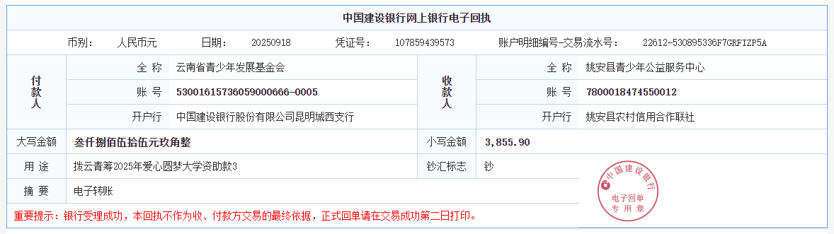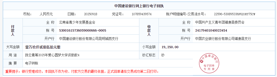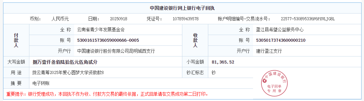 第五期拨款:由广大爱心人士线上线下捐赠的爱心善款259113.29元已于2025年9月18日划拨至弥渡县希望公益服务中心、开远市红十字会、姚安县青少年公益服务中心、中国共产主义青年团镇康县委员会、保山市希望公益服务中心、云龙县希望公益服务中心、中国共产主义青年团大姚县委员会、盈江县希望公益服务中心、文山州希望公益服务中心及永仁县15名大学新生个人银行卡、双江县1名大学新生个人银行卡,用于资助弥渡县12名大学新生、开远市43名大学新生、姚安县9名大学新生、镇康县9名大学新生、保山市2名大学新生、云龙县1名大学新生、大姚县1名大学新生、盈江县79名大学新生、文山州1名大学新生、永仁县15名大学新生、双江县1名大学新生。