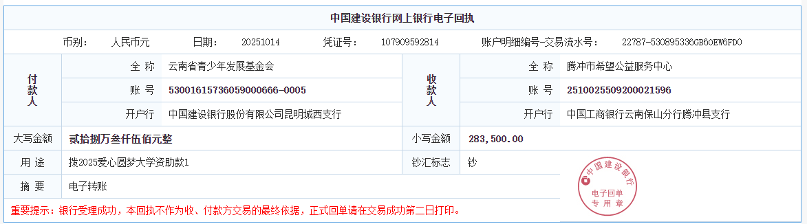 第七期拨款:由广大爱心人士线上线下捐赠的爱心善款299837.6元已于2025年10月14日划拨至腾冲市希望公益服务中心、中国共产主义青年团河口瑶族自治县委员会、中国共产主义青年团元谋县委员会、元阳县希望公益服务中心、蒙自市希望公益服务中心,用于资助腾冲市135名大学新生、河口县1名大学新生、元谋县6名大学新生、元阳县1名大学新生、蒙自市5名大学新生。
