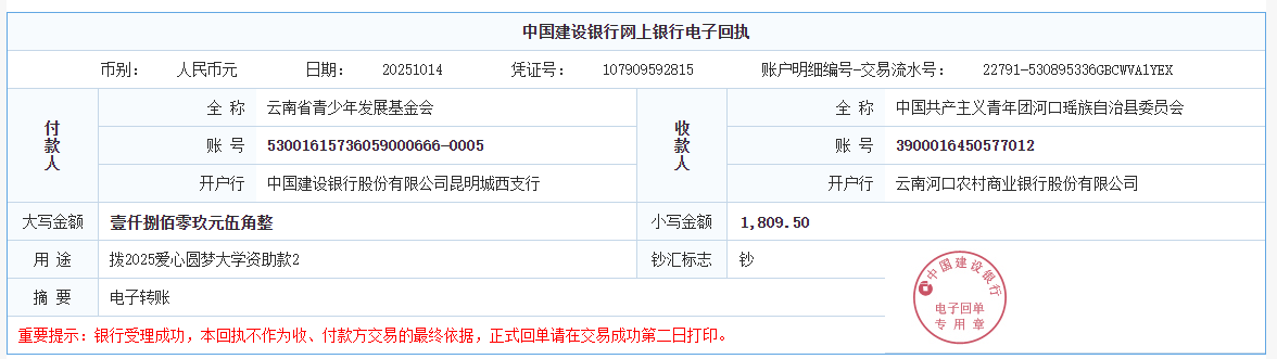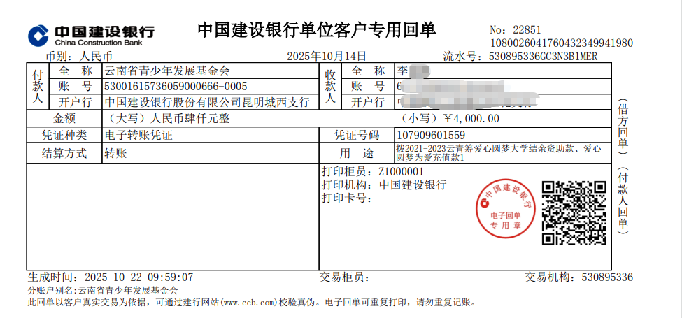 第八期拨款:由广大爱心人士捐赠的爱心善款1788.33元及其他项目款共4000元已于2025年10月14日划拨至大学新生李同学银行卡。