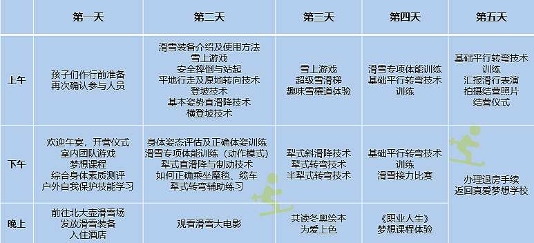 费用包含:滑雪场场地费、培训项目费、住宿费、国家队营养配餐餐费,装备租赁费、真爱梦想学校与雪场间往返接送费用、人身意外伤害保险等。