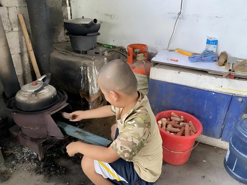 近期,志愿者们实地走访时遇到了杰杰,原本幸福的一家四口,却因爸爸的突然离世,生活的重担全压在了妈妈一人肩上,杰杰的爷爷年事已高,也不得不时常出去捡些废品,换取微薄的收入来补贴家用。当我们推开门的那一刻,杰杰蹲在土灶前,摆弄着手中的柴火,正准备生火做饭,锈迹与烟灰交织,诉说着生活的沧桑。杰杰熟练地操作着,试图让柴火燃起,为这个家带来一丝烟火气。他的哥哥在外求学,母亲为生计奔波,杰杰便默默承担起家务,用稚嫩的双手为家出一份力。