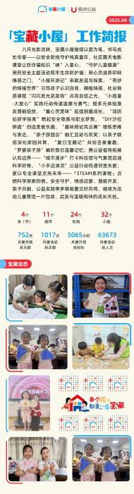 宝藏小屋选点在社区活动中心、学校附近或社区租房,环境安全,尽量根据儿童友好的原则进行布置。小屋配备图书玩具等基础物资。每周开放至少5天,开展儿童陪伴、图书借阅、困境儿童帮扶等基础服务。