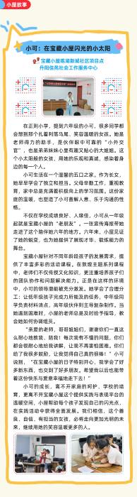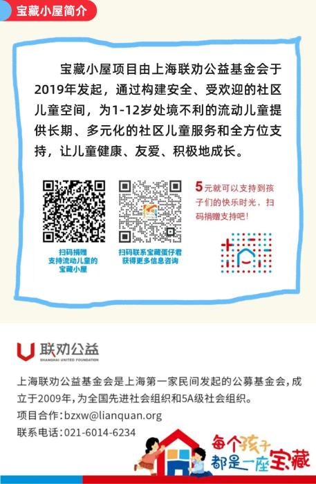 宝藏小屋是一个安全、受孩子喜欢的社区儿童空间,通过提供长期持续、多元化的社区儿童服务,让1-12岁处境不利的流动儿童成长为健康、友爱、积极的人。