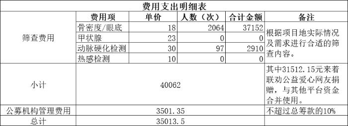 | 项目直接支出-活动费用-居民健康筛查服务 | 每位居民进行4项筛查项目的平均成本约为60元,筛查人员将针对居民健康管理进行筛查,并进行相关疾病健康教育知识科普教育,提升居民健康意识。筛查项目包括:骨密度/骨龄筛查、眼底筛查、动脉硬化筛查、幽门螺旋杆菌筛查、甲状腺结节筛查、乳腺结节筛查,根据地区实际情况选取其中4项进行筛查。 | 1,800,000.00 元 |