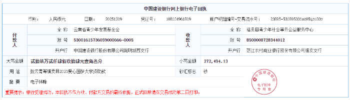 第十期拨款:由广大爱心人士捐赠的爱心善款272494.13元已于2025年12月9日划拨至福贡县青少年社会事务公益服务中心,用于资助福贡县84名大学新生。