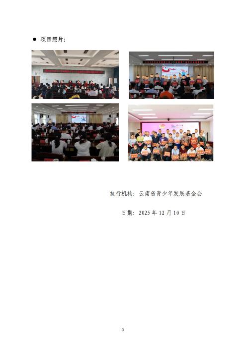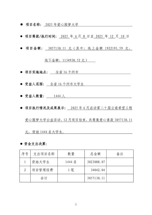 项目报告:2025年第二十届云南希望工程爱心圆梦大学公益活动共筹集爱心善款3057130.11元(其中:线上金额1922191.59元,线下金额:1134938.52元),3023088.07元用于资助1444名大学生,34042.04用于项目管理经费。
